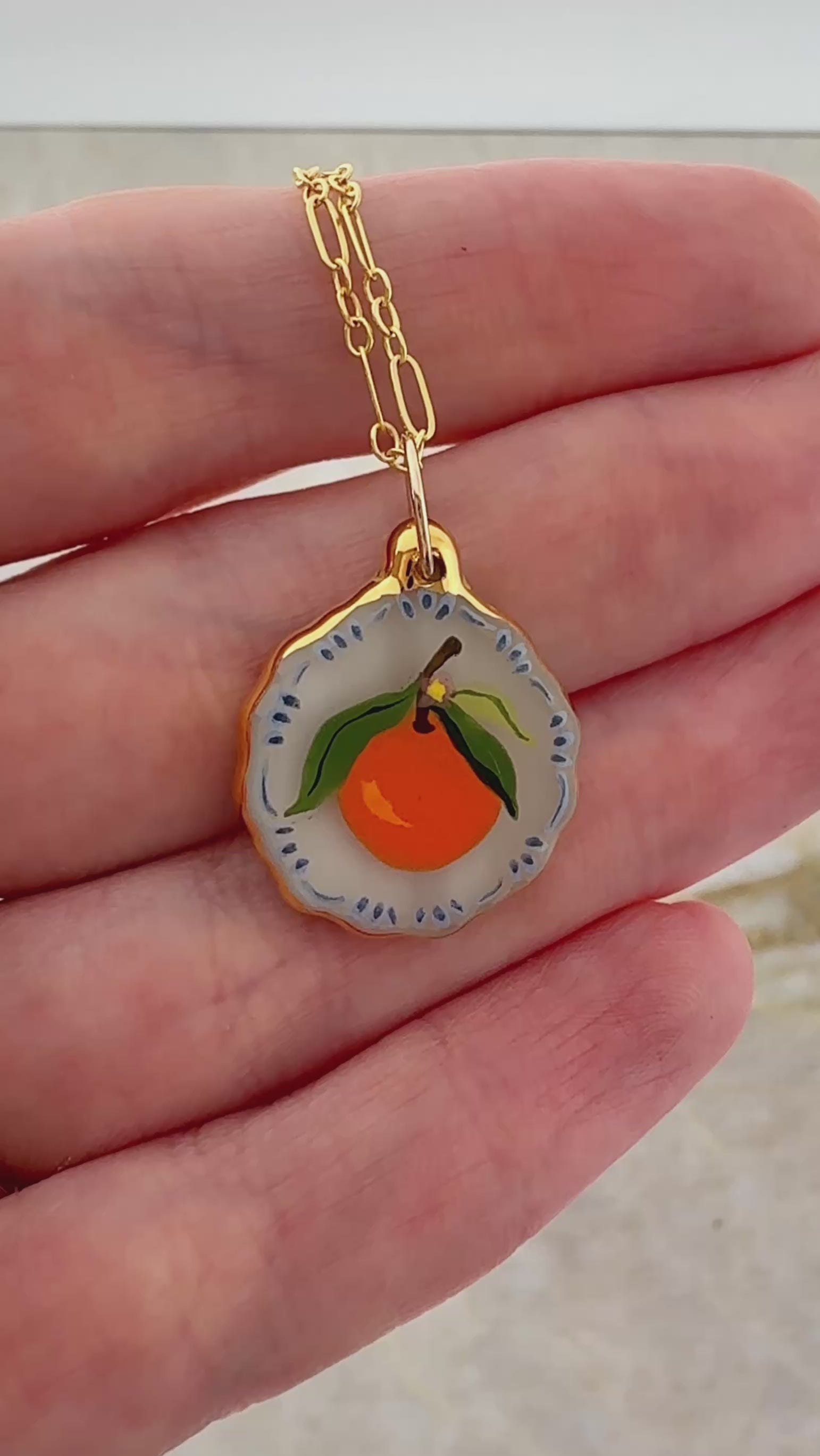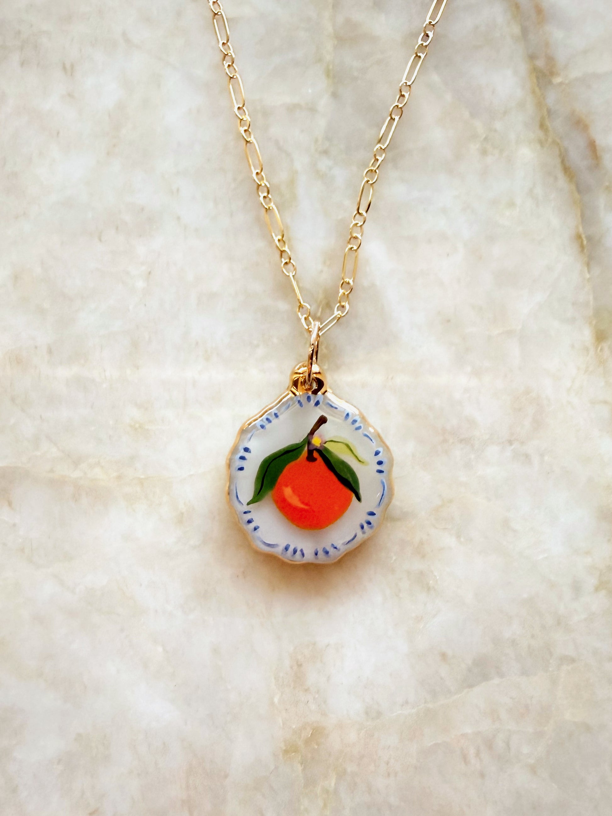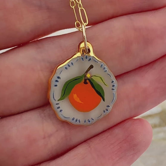 A round scalloped charm with an orange and blue decorative border. The charm has 24k gold luster painted on the edges. Each charm comes with an 18 inch gold filled chain.