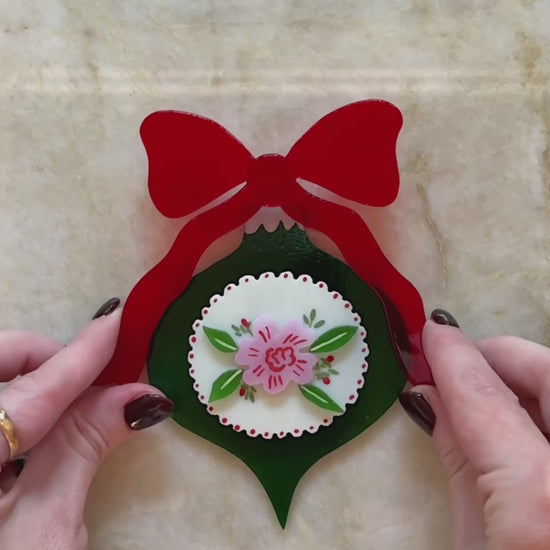 This deep green glass ornament has a scalloped cream center with a pink flower and red hand-painted details, finished with a bright red bow for a classic holiday feel.