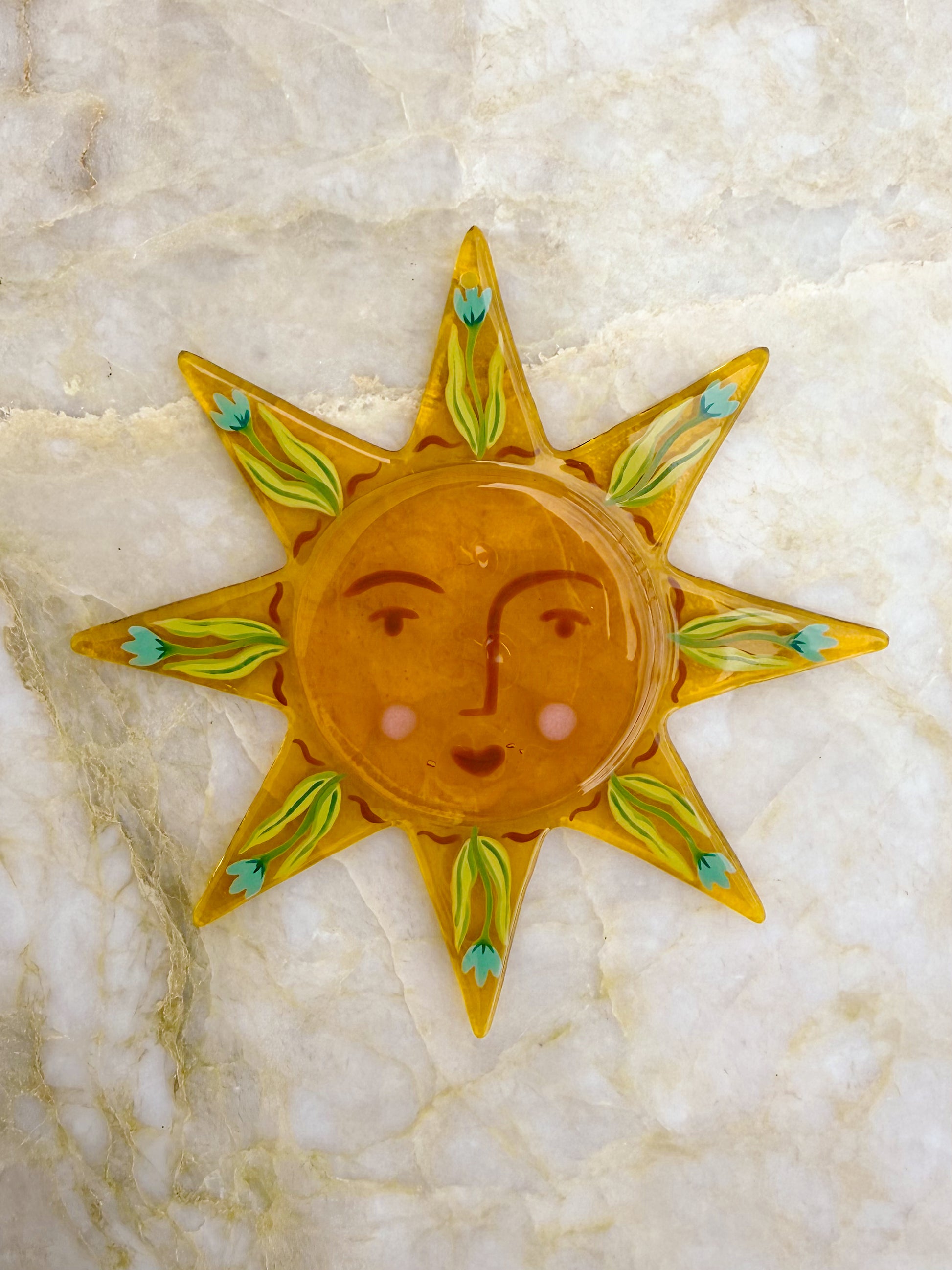 Bring a touch of warmth and color to your space with this beautiful floral yellow sun suncatcher, available in three vibrant designs: yellow, purple, orange, blue or red.