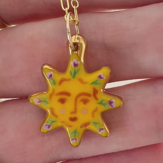 Yellow sun charm with purple flowers and a face with 24k gold luster painted on the edges. Each charm comes with an 18 inch gold filled chain.