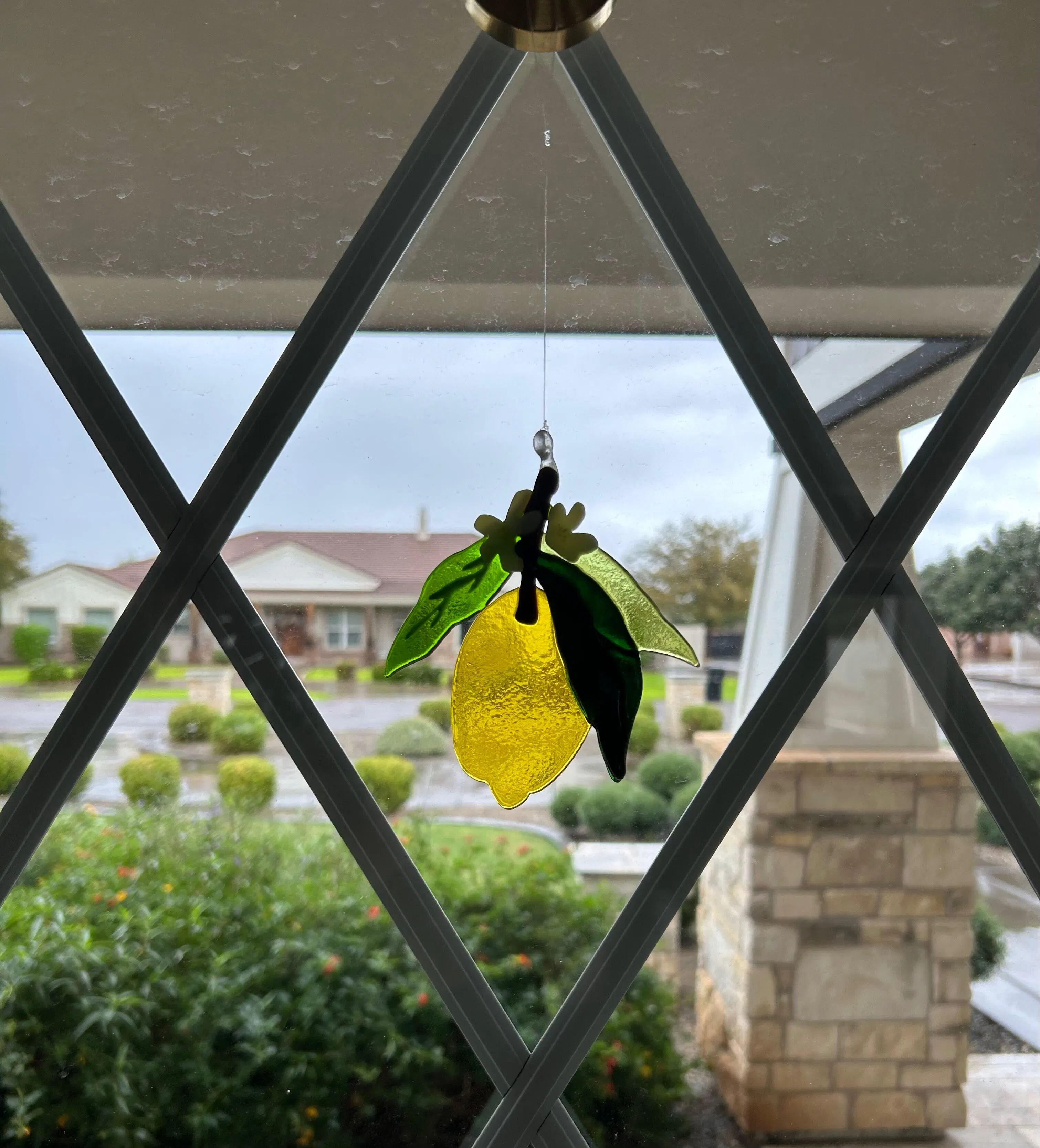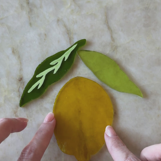 This glass lemon has the most beautiful yellow glass with green leaves, brown stem, and two lemon cream blossoms. The yellow glows warmly in the light giving it a bright and sunny look.