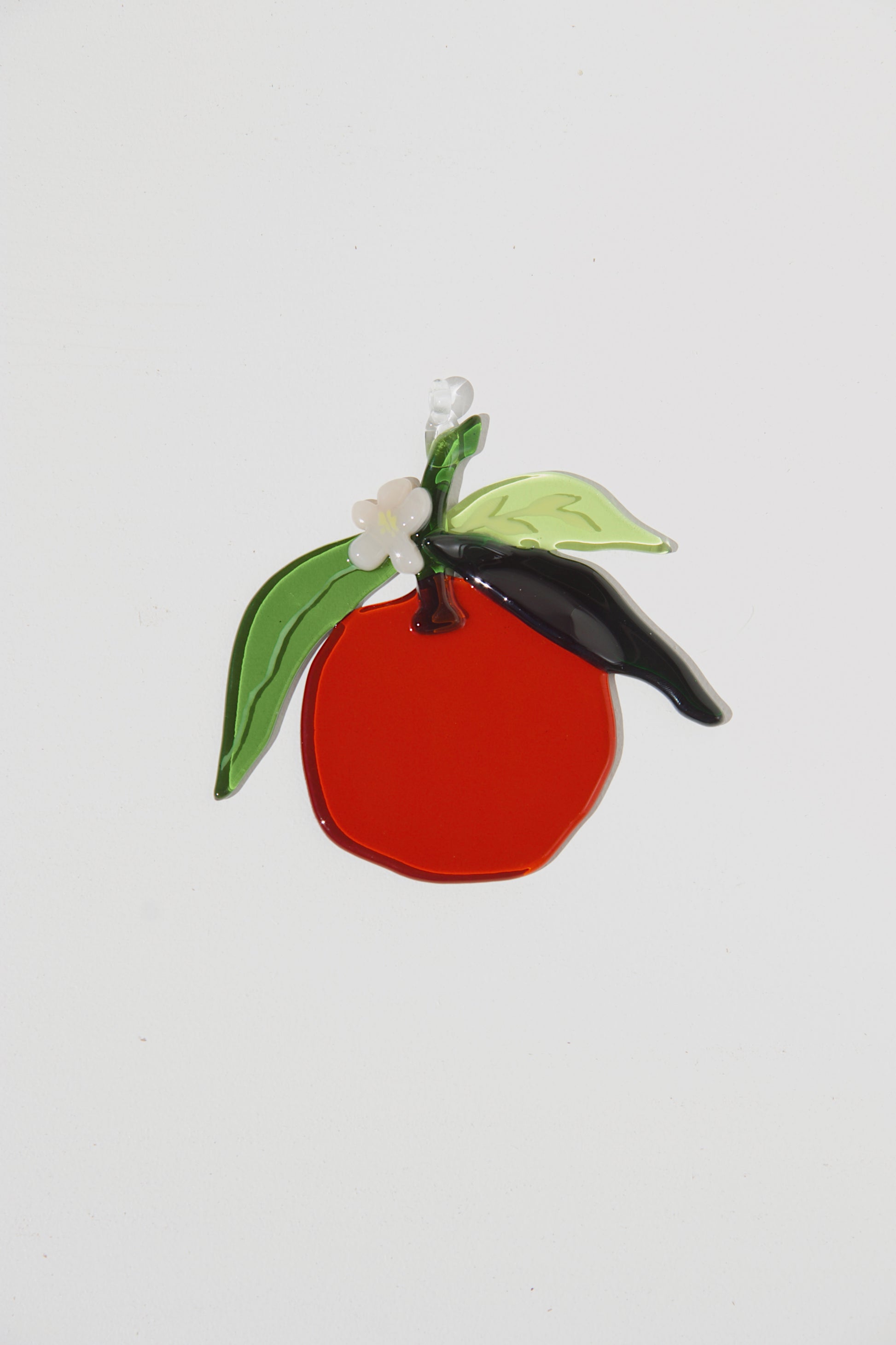 This glass orange is bright and cheerful, with a rich orange color that catches the light beautifully. The leaves are made with 3 different shades of green along with a little pink blossom.