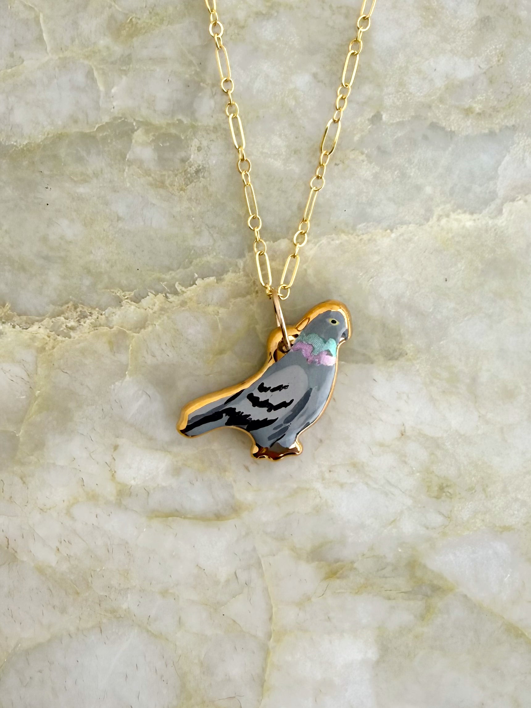 A pigeon charm with 24k gold luster painted on the edges.