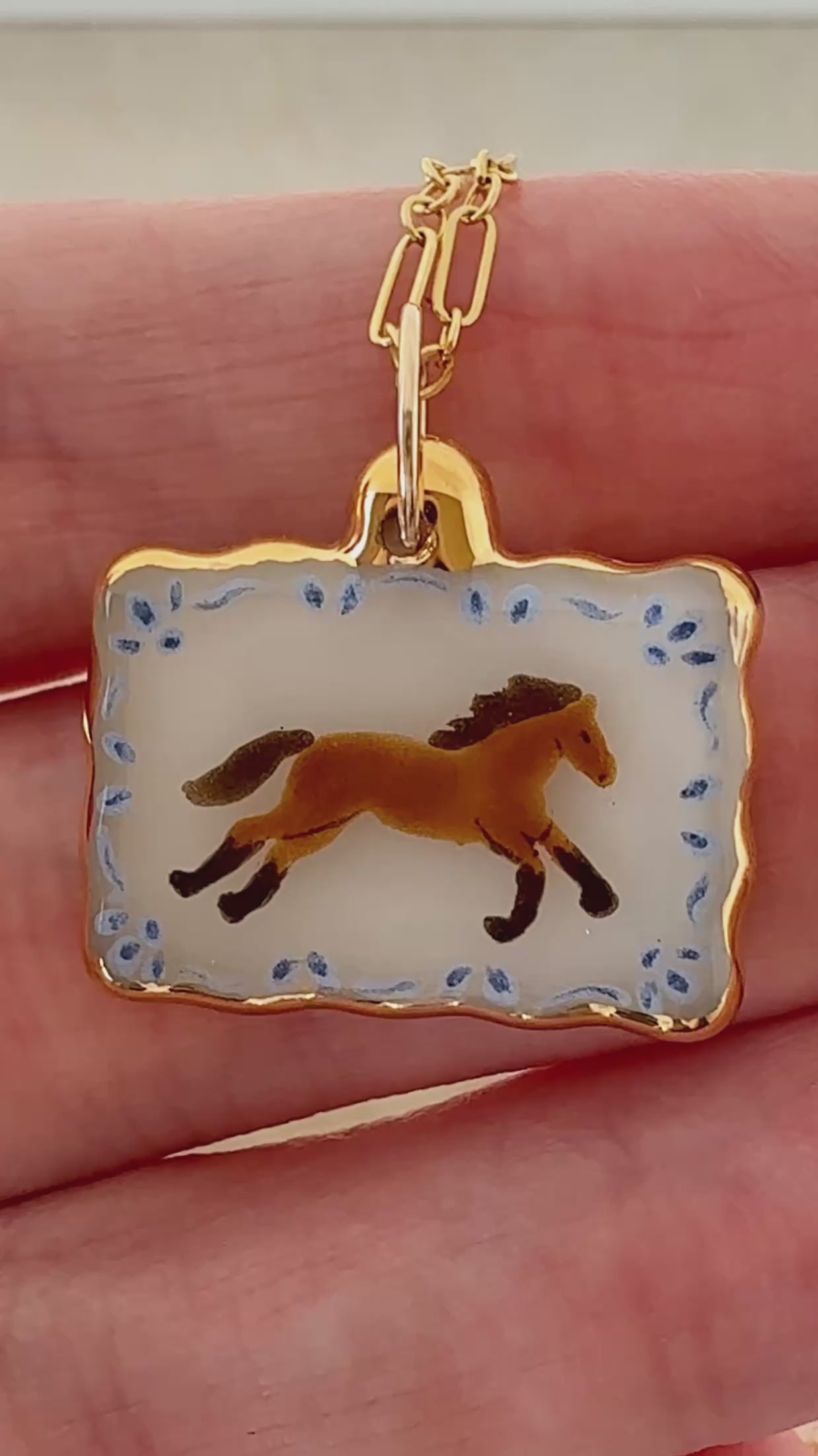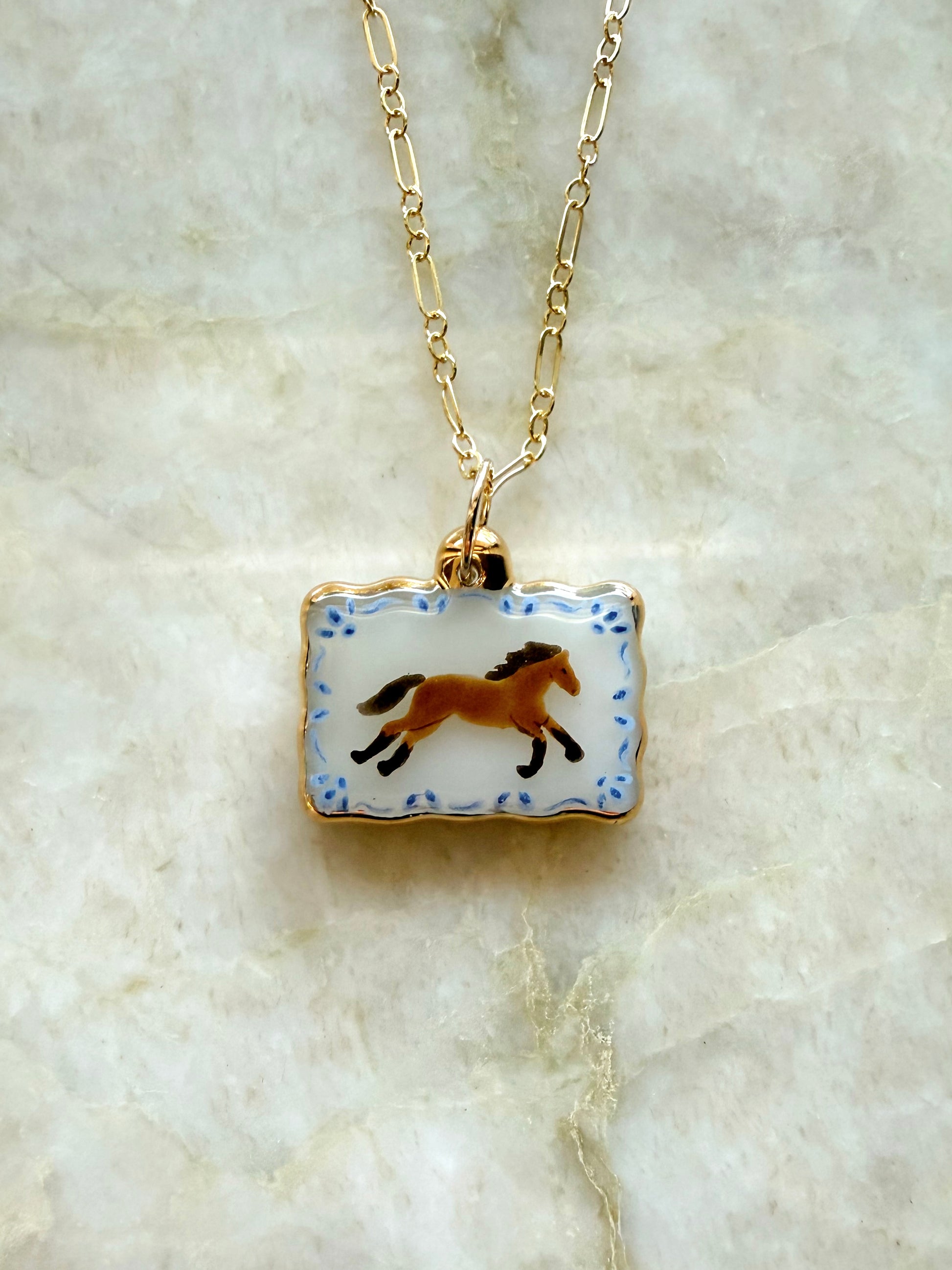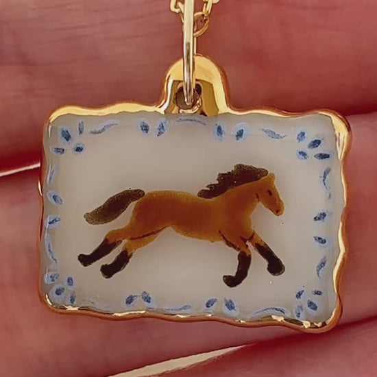 A scalloped rectangle with a running wild horse and blue decorative border. The charm has 24k gold luster painted on the edges. Each charm comes with an 18 inch gold filled chain.