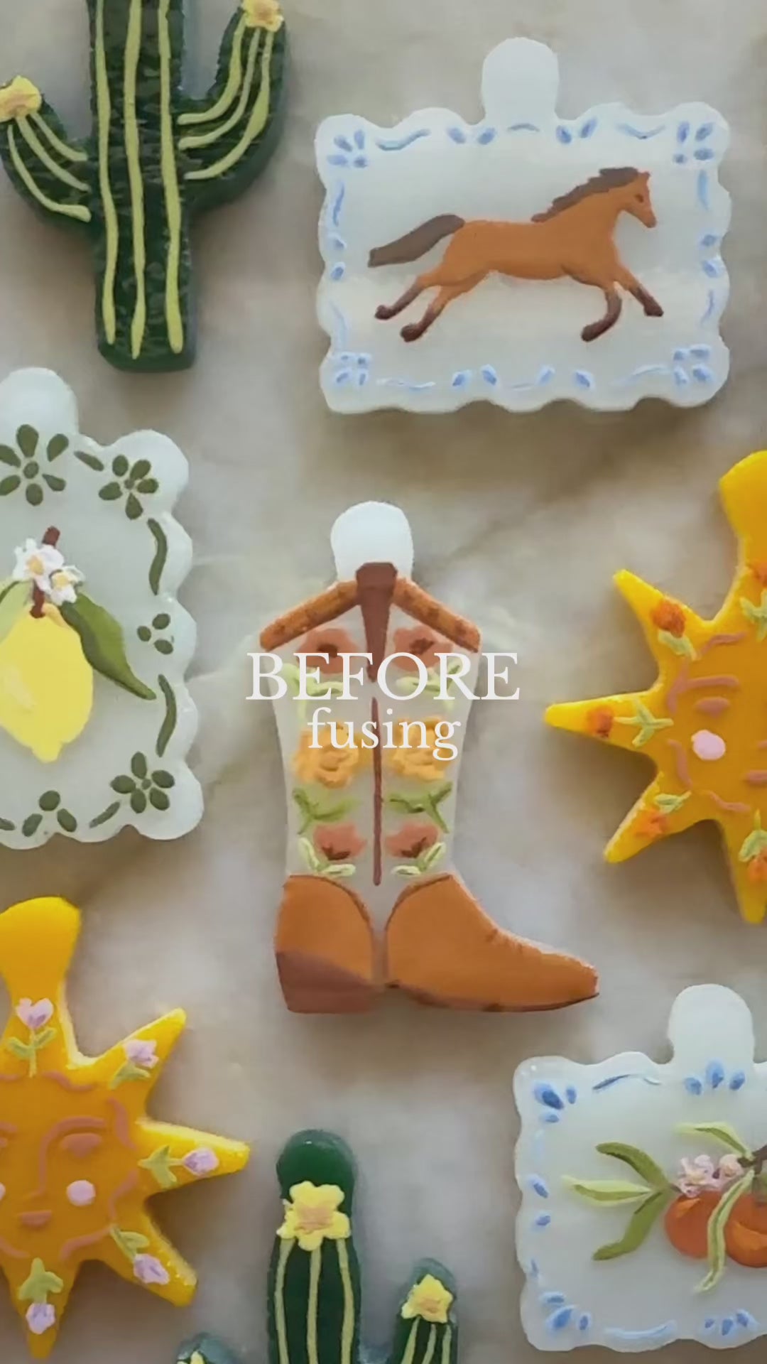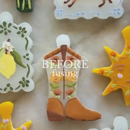All paint details are hand painted on before fusing and are permanent.