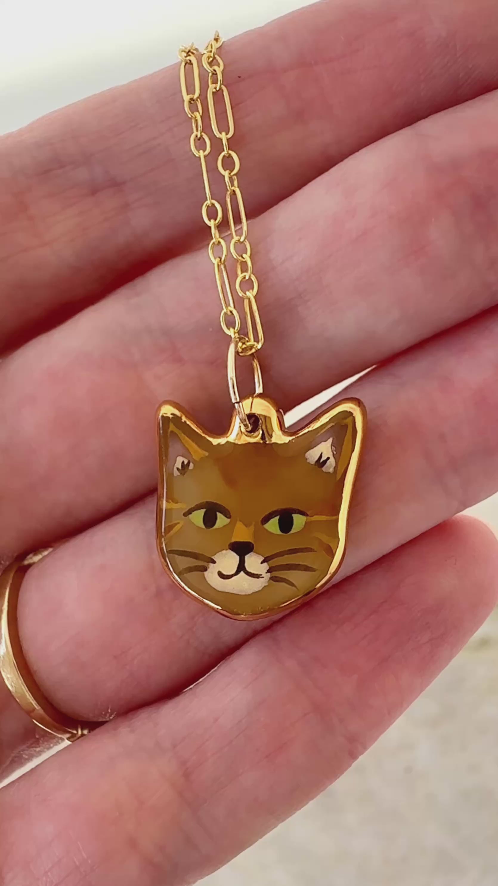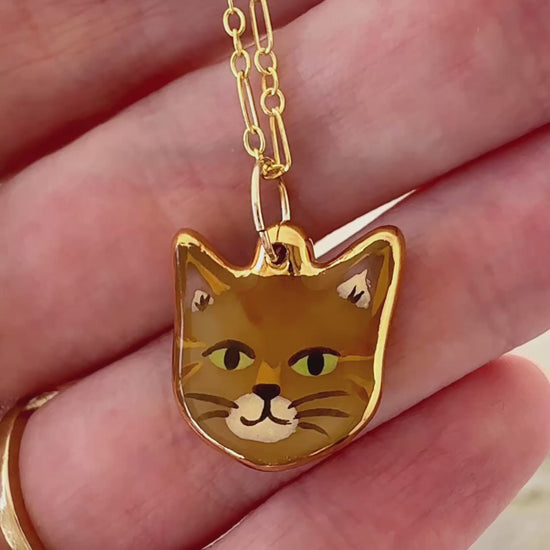An orange cat charm with 24k gold luster painted on the edges.